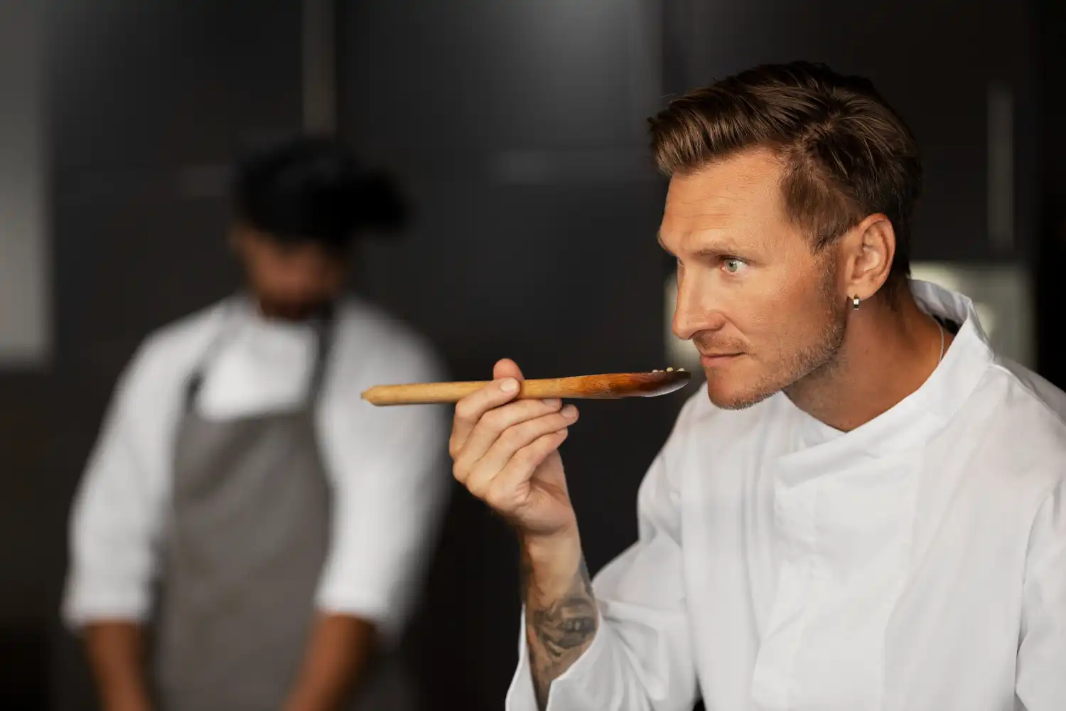 Интерьер ресторана разработан дизайнерским бюро TAR Group и передает атмосферу севера Италии.